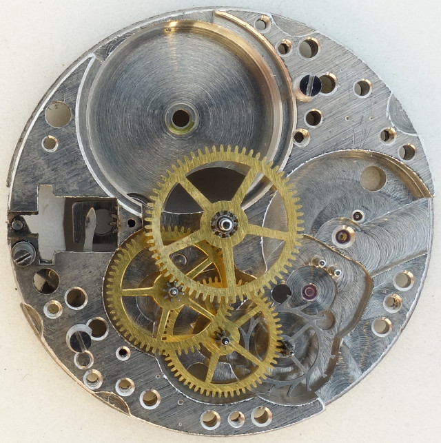 Der Räderwerksaufbau ist absolut klassisch mit direkt angetriebenem Minutenrad, gefolgt von Kleinbodenrad, Sekundenrad (mit dezentraler Sekundenanzeige) auf 6 Uhr, sowie Stahl-Ankerrad.