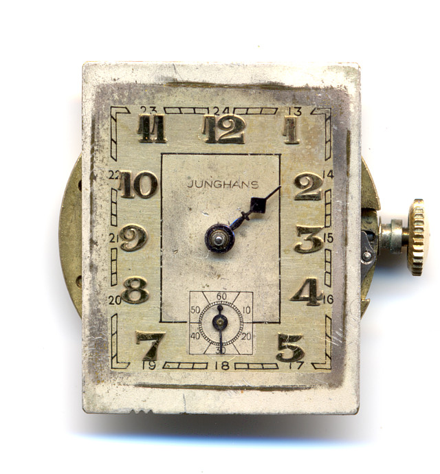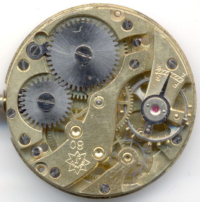Anfang der 1930er Jahre debutierte das Junghans-Kaliber J80, eines der ersten echten hauseigenen Armanduhrenwerke. Es wurde fast 20 Jahre lang produziert. Die frühesten Ausführungen, so wie hier gezeigt, besaßen noch einen getrennten Ankerradkloben. Die Ausstattung mit Lagersteinen begann mit 7 und endete mit 17 Steinen.