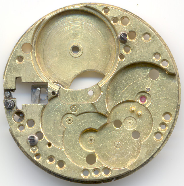 Schon die gelb gebrannte Grundplatine schickt einen in die 30er Jahre zurück. Damals war es auch noch üblich, dass preiswerte Werke mit wenig bis keinen Lagersteinen ausgestattet waren. Das Junghans J80 macht in der hier gezeigten, einfachsten Ausführung keine Ausnahme, lediglich die Unruhwelle ist steingelagert, ansonsten findet man nur Messinglager vor.