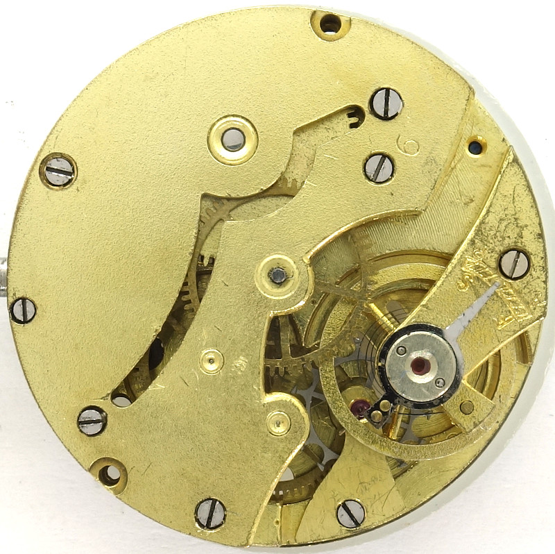 Der Aufbau des Räderwerks ist typisch für ein Zylinderwerk: Das Federhaus treibt das zentrale Minutenrad an, gefolgt vom Kleinbodenrad, Sekundenrad auf 6 Uhr und dem Stahl-Zylinderrad.
