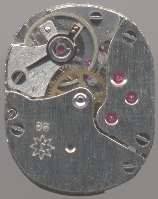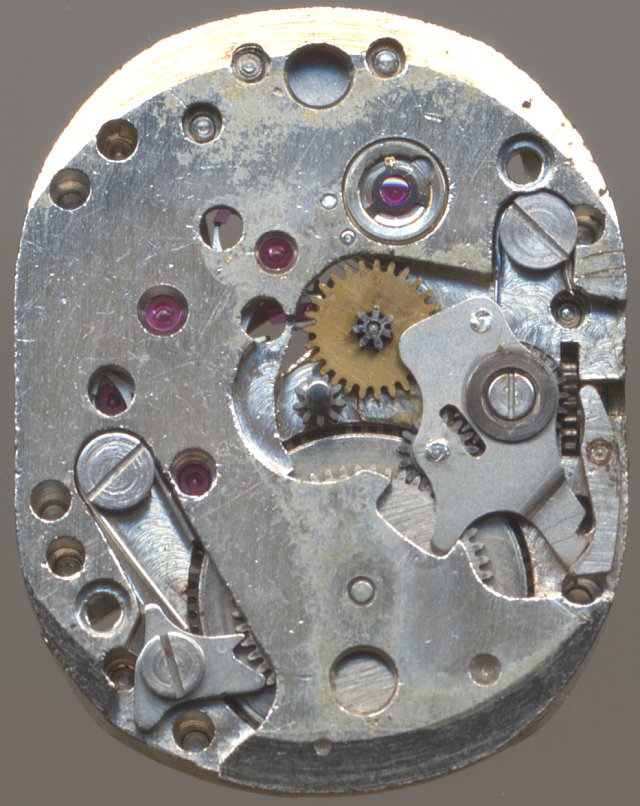Als Aufzug fungiert ein preiswerter, zifferblattseitig verbauter Wippenaufzug - ein Ausstattungsmerkmal, das bei zahlreichen preiswerteren Steinankeruhren der 50er Jahre zu finden ist. Technisch ist zwar ein Kupplungsaufzug besser, haltbarer und leichter zu warten, aber bei dem hier verbauten Kupplungsaufzug kann auch ohne Lösen des Zifferblatts seitlich die Sperrfeder beiseite geschoben werden, um die Zugfeder zu entspannen - ein durchaus nützliches Detail.