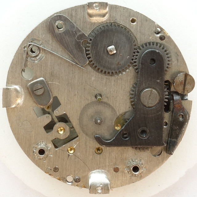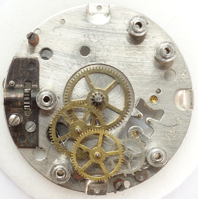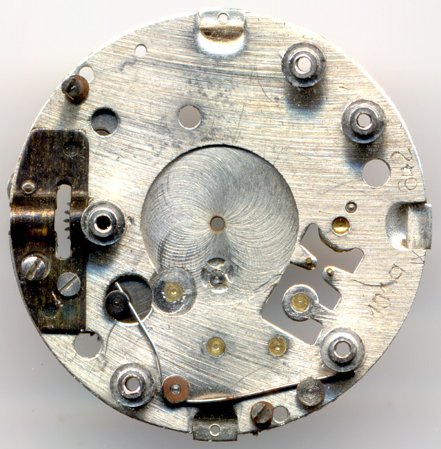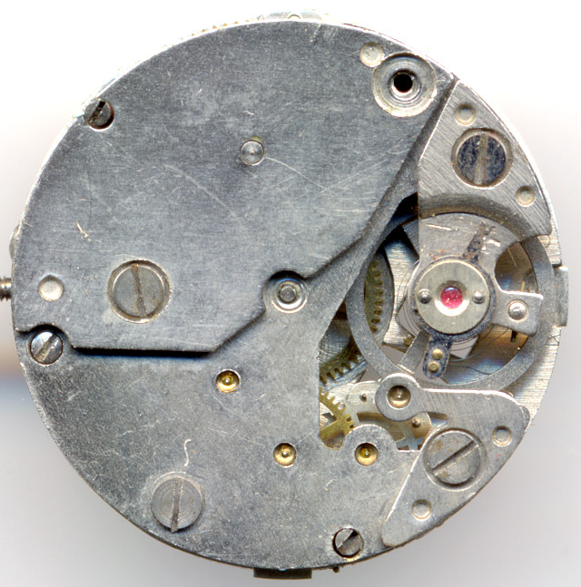 Die steinlose Grundplatine des hier gezeigten K9 besitzt im 90°-Winkel vier Laschen, von denen zwei mit Lagern für die Zifferblattschrauben ausgestattet sind. Im Vergleich mit dem K48 sind die Laschen weit weniger ausladend.