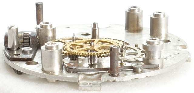 Das Räderwerk ist wieder ein klassisches Stiftanker-Räderwerk mit direkt angetriebenem Minutenrad, Kleinbodenrad, Sekundenrad auf 6 Uhr (das zifferblattseitig eine dezentrale Sekunde tragen könnte und Stahl-Ankerrad.