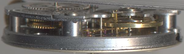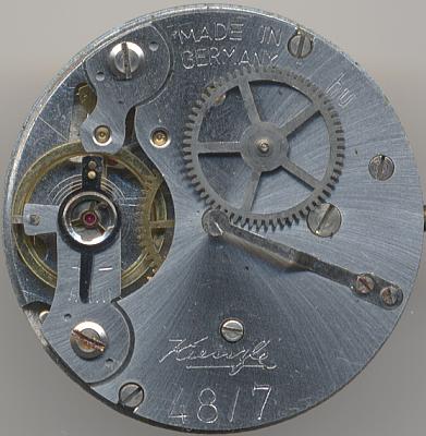Dieses Stiftankerwerk von Kienzle ist wegen eines Details sehr interessant: Die Ankerstifte sind aus synthetischen Rubinen gefertigt und nicht, wie sonst bei Stiftankerwerken üblich, aus Metall. Auf dem Photo kann man die beiden roten Rubinstifte gut erkennen. Außerdem besitzt es eine indirekt angetriebene Zentralsekunde und, in älteren Kienzle-Werken eher selten zu finden, eine im Hause gefertigte Stoßsicherung.