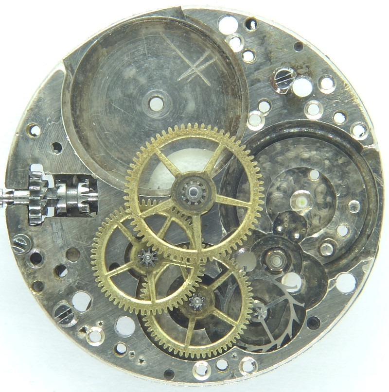 Das Räderwerk ist traditionell konstruiert, mit direkt angetriebenem zentralen Minutenrad, Kleinbodenrad, Sekundenrad auf 6 Uhr und dem filigranen Stahl-Ankerrad. Letzteres ist sogar noch old-school-mäßig unter einem eigenen Kloben gelagert.
