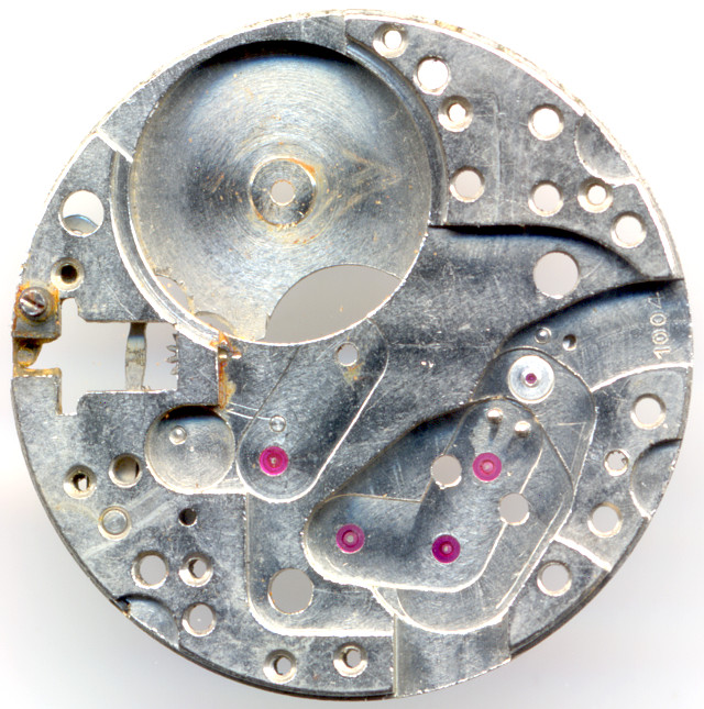 Die Grundplatine dieses 17-steinigen Werks zeigt die typischen Produktionsmuster der Jahrhundertmitte. Alle schnelldrehenden Lager sind mit synthetischen Rubinen ausgestattet, und bei 6 Uhr liegt das Sekundenrad, mit dem (allerdings nicht hier) eine dezentrale Sekunde angezeigt werden kann.