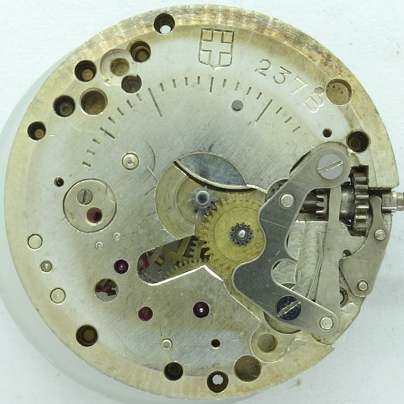 Auf der noch leeren Zifferblattseite erkennt man noch die Signatur des Basiswerks, Kaliber 237B, welches wiederum eine modifizierte Version des Kalibers 237 ist.