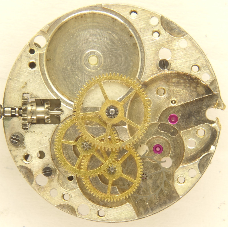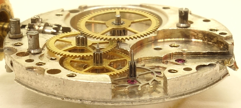 Es wird der typische Räderwerksatz mit direkt angetriebenem Minutenrad, Kleinbodenrad, Sekundenrad auf 6 Uhr und Stahl-Ankerrad verwendet.