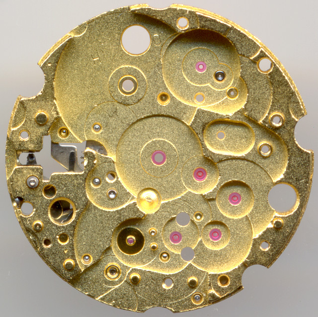 Schon die Grundplatine läßt erahnen, dass es sich hier um ein äußerst ausgereiftes und funktionssicheres Werk handelt. Nicht weniger als 21 Lagersteine wurden hier verbaut, selbst das zentrale Minutenrad ist steingelagert.