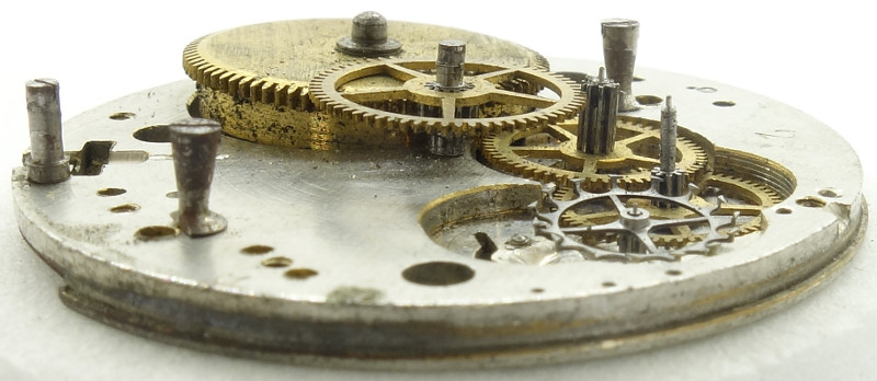 Das Zylinderrad ist unter einem eigenen Kloben gelagert, ob dieser bereits im Original abgeschliffen war, oder ob dessen Höhe reduziert werden mußte, damit der Reif der Unruh nicht an ihm schleift, ist nicht zu ermitteln.