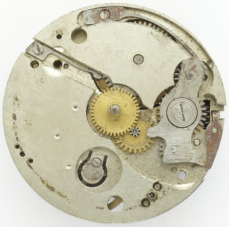 Wie man schon an der Grundplatine erkennen kann, ist das weitestgehend steinfreie Kaliber (mit Ausnahme des oberen Unruhlagers) von eher einfacher Qualität.