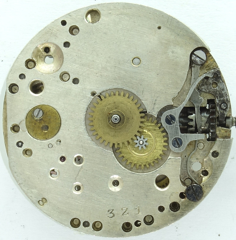 Zfferblattseitig fällt vor allem die fein ausgeführte Winkelhebelfeder auf, mit ihrer Hilfe kann das Werk eindeutig identifiziert werden.