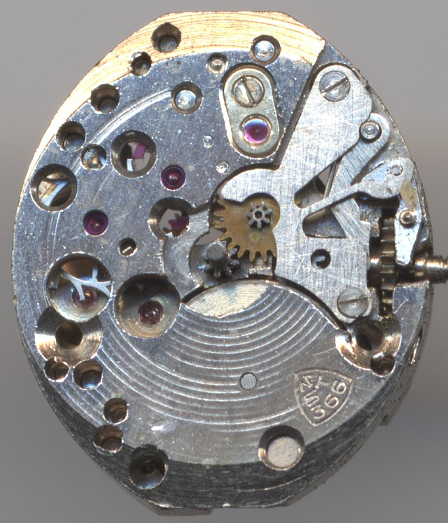 Ein recht hochwertiges Damenuhren-Formwerk ist das von Roamer verwendete, hauseigene MST Kaliber 366. Es ist mit 17 Lagersteinen ausgestattet, verwendet eine Schraubenunruh (noch nicht stoßgesichert) und einen Ringschlüssel mit langem Rückerzeiger zum Regulieren.