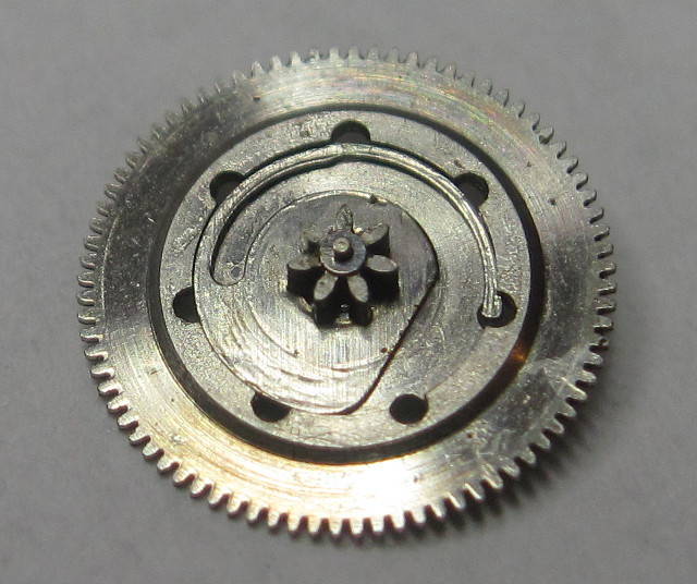 Das zweite, große Reduktionsrad besitzt auf seiner Unterseite eine Lamellenkupplung, die dafür sorgt, daß das Automaticgetriebe bei Handaufzug abgetrennt und somit geschont wird: