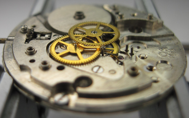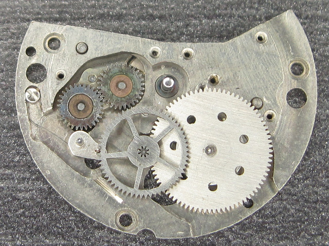 Auf der Zifferblattseite erkennt man wieder den Kupplungsaufzug, sowie das geschlossene Wechselrad des Zeigermechanismus.