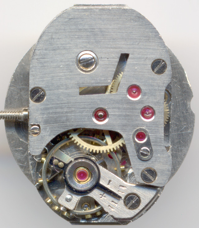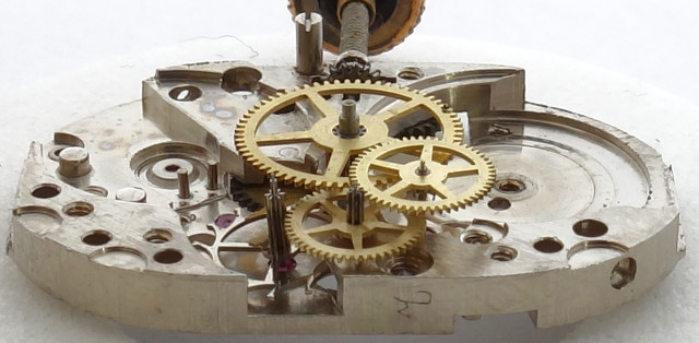 Anhand der Grundplatine erkennt man, daß alle wichtigen Lager bis auf das Minutenrad mit Lagersteinen versehen sind. Ebenso wird der gedrungene mehrstöckige Aufbau sichtbar, bei dem das Lager des Sekundenrads oberhalb des Ankerrads liegt.