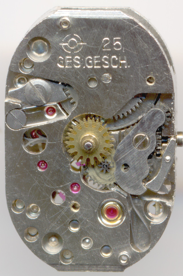 Eines der seltenen Damenuhren-Formwerke mit Datumsanzeige ist das Otero 251, das auf dem Basiskaliber Otero 25 fällt dieses, in den späten 1950er / frühen 1960er Jahren gebaute Werk ziemlich klein aus.