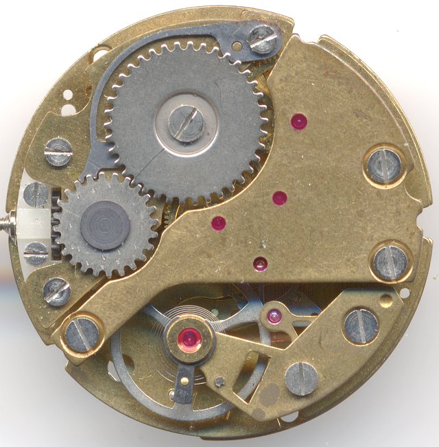 Zifferblattseitig findet man den, bei Stiftankerwerken häufig verwendeten Roskopf-Aufbau wieder mit dem Federhausrad (aus Plastik!), das gleichzeitig als Wechselrad verwendet wird. Minuten- und Stundenrohr werden hierbei indirekt angetrieben und können beide von der Zentrumsachse entfernt werden.