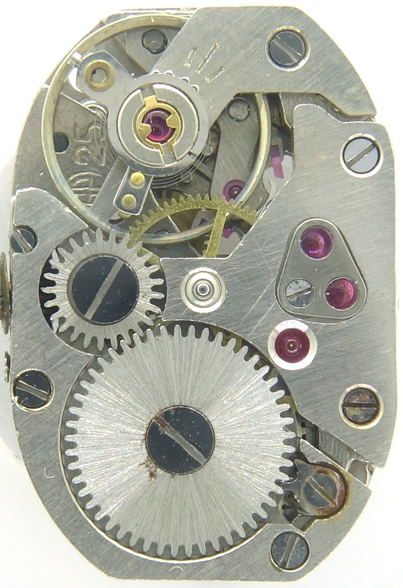 Der Räderwerksaufbau ist typisch für diesen Werkstyp: Das Federhaus treibt das recht große zentrale Minutenrad an, gefolgt von einem relativ kleinen Kleinbodenrad, einem regelrecht winzigen Sekundenrad und dem wieder großen Ankerrad.