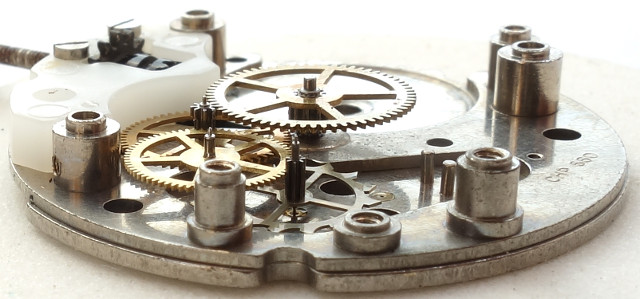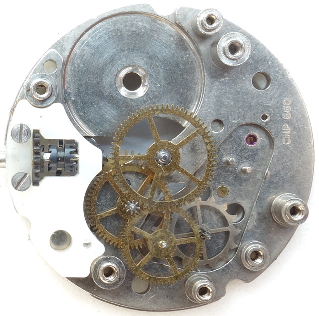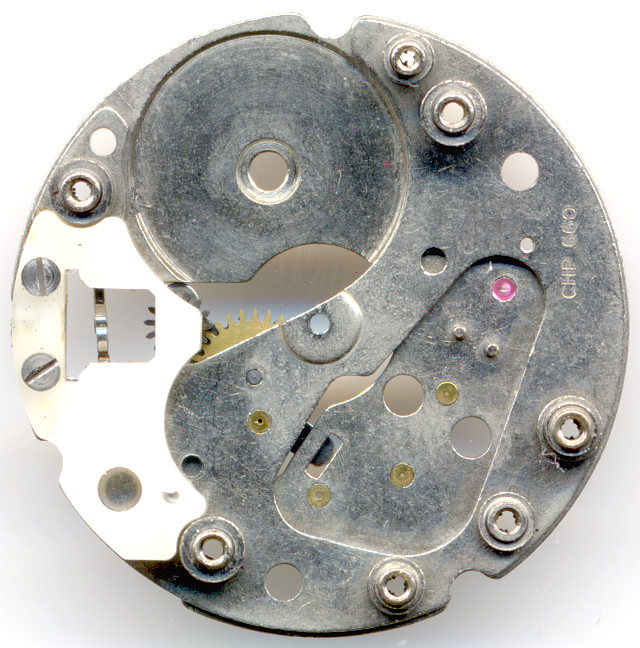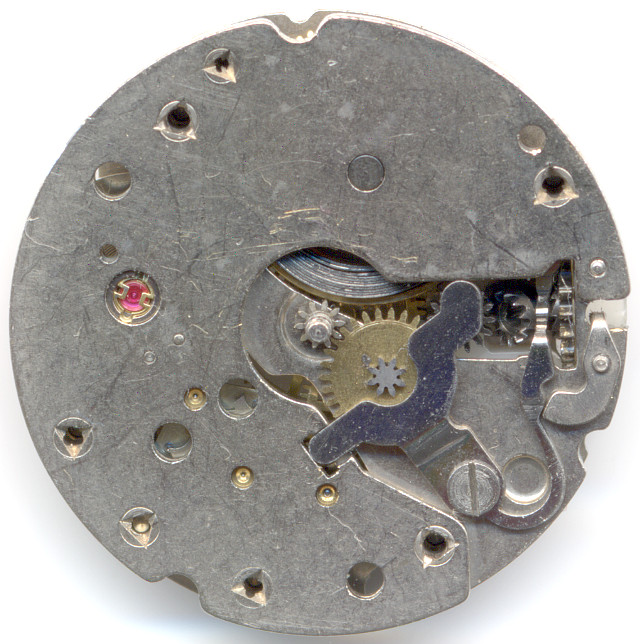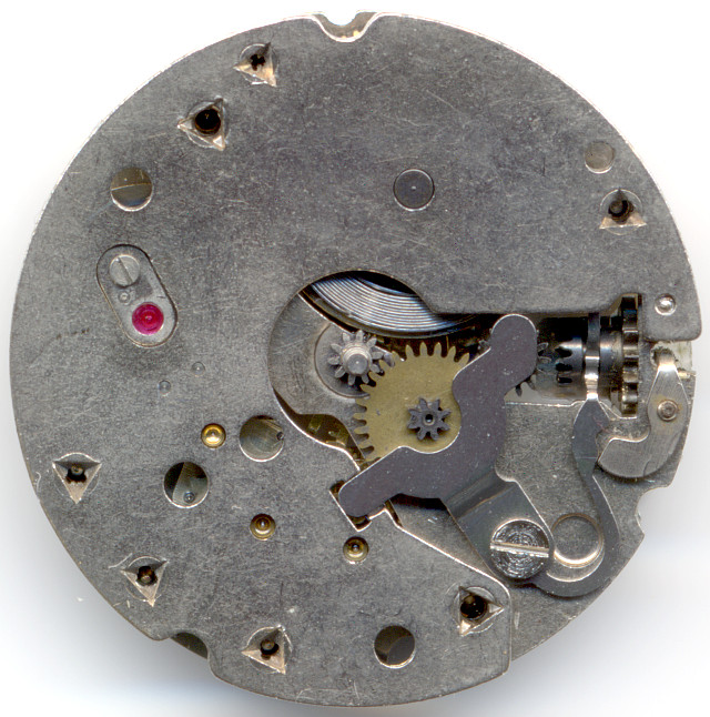 Auf der Zifferblattseite sieht man den Kupplungsaufzug, dessen ausgestanzter Kupplungshebel gleichzeitig auch die Kupplungshebelfeder ist und zudem die Abdeckung für das Zeigerstellrad und das Wechselrad ist. Diese Konstruktion ist maximal einfach und doch absolut ausreichend.