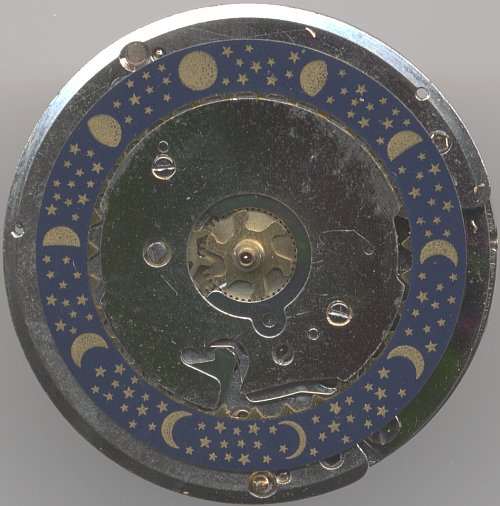 Das Kaliber E355 ist ein einfaches Stiftankerwerk mit nur einem Stein und ohne Stoßsicherung. Die einzige Besonderheit ist seine falsche Mondphasenanzeige: Anstelle der Datumszahlen wurde der Datumsring einfach mit zehn verschiedenen Mondphasen bedruckt. Im Grund genommen keine so schlechte Idee, wäre da nicht das Problem, daß ein kompletter Monddurchlauf 28,5 Tage benötigt, ein kompletter Umlauf der Datumsscheibe aber 31 Tage.