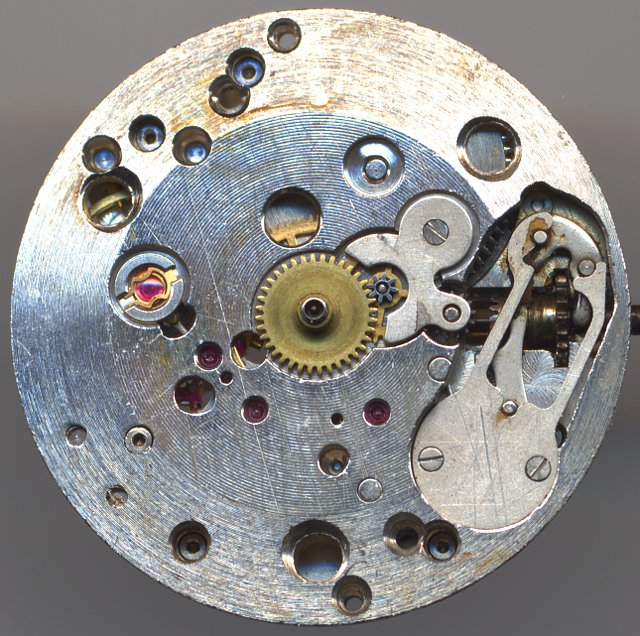 Es besaß noch eine direkt angetriebene Zentralsekunde, sowie eine direkt angetriebene Minutenanzeige aus der Mitte hinaus. Soweit ist das nichts besonders, allenfalls eine recht klassische Werkskonstruktion. Was das Werk aber so besonders macht, ist seine goldfarbige Schraubenunruh, an der eine Breguet-Spirale verbaut wurde.