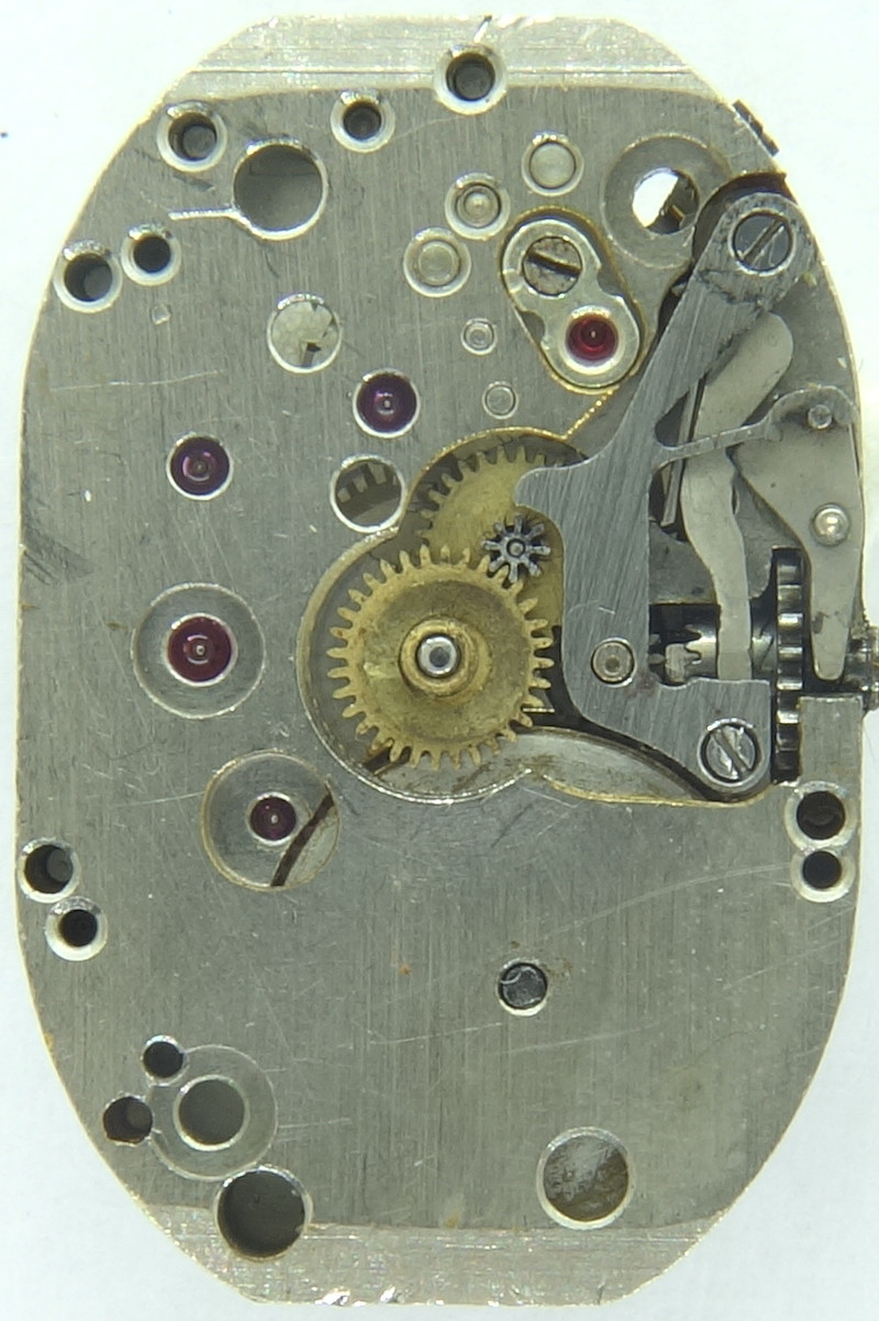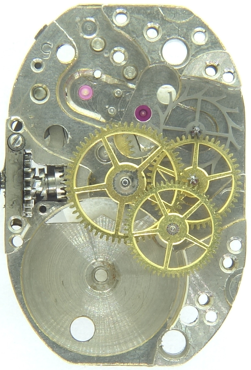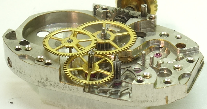 Zifferblattseitig erkennt man schön den Kupplungsaufzug und die charakteristisch geformte Winkelhebelfeder.