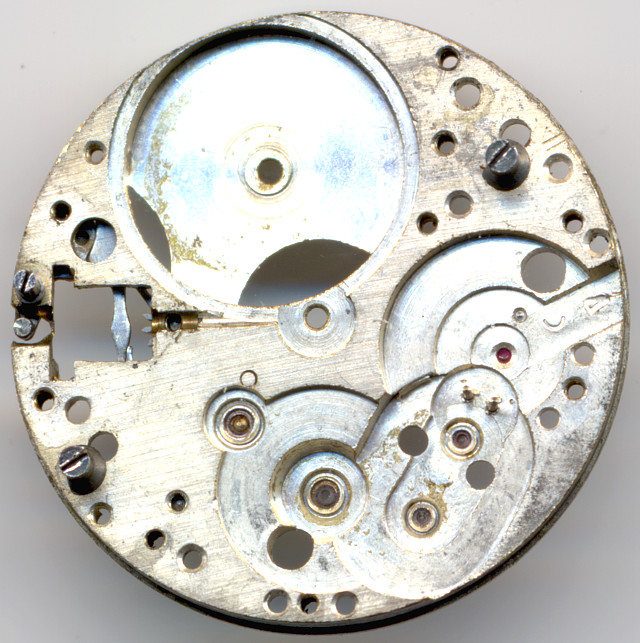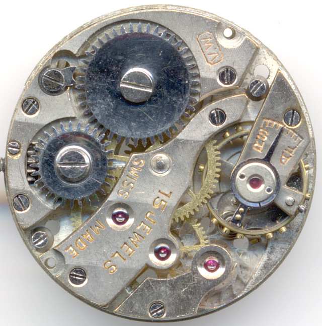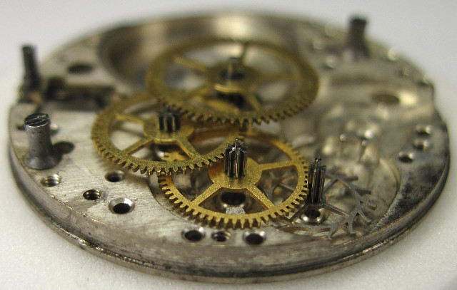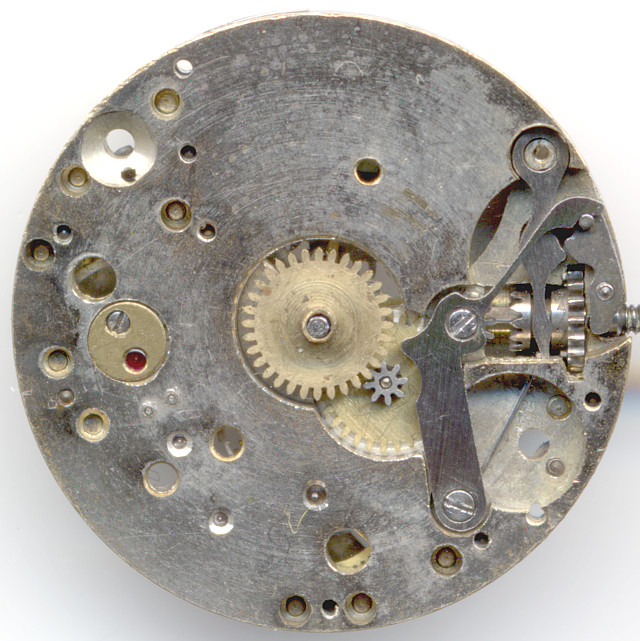 Der Räderwerksaufbau war den 1940er Jahren Stand der Technik: Direkte Minute aus der Mitte, Großbodenrad, Sekundenrad, Ankerrad.