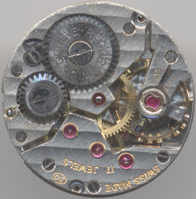 Ein selten schönes Damenuhrwerk ist das hier beschriebene Kaliber 50 von Record. Es besticht nicht nur durch seinen durchdachten Aufbau, sondern auch durch die goldene Glucydur-Schraubenunruh, die alleine schon eine Augenweide ist, durch die Verzierung mit Genfer Streifen, sondern vor allem durch seine, in Chatons gefaßten Lagersteine.