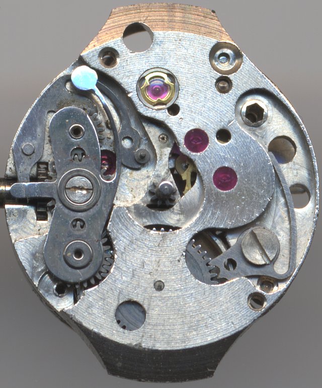 Der Wippenaufzug ist zifferblattseitig angebracht; bemerkenswert ist die Sperrklinke mit integrierter Feder.