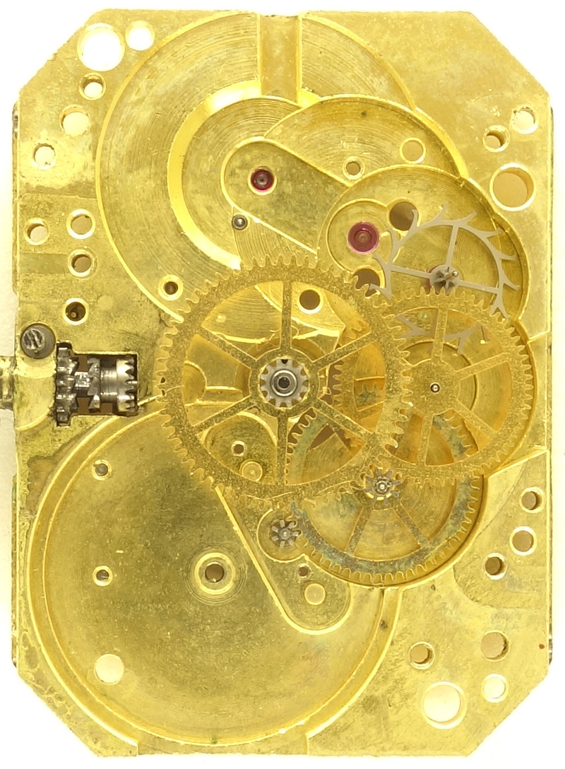 Eine der Besonderheiten dieses Werks ist die indirekte dezentrale Sekundenanzeige auf 6 Uhr, die vom Kleinbodenrad angetrieben wird. Dies war notwendig, weil das eigentliche Sekundenrad auf 9 Uhr liegt.