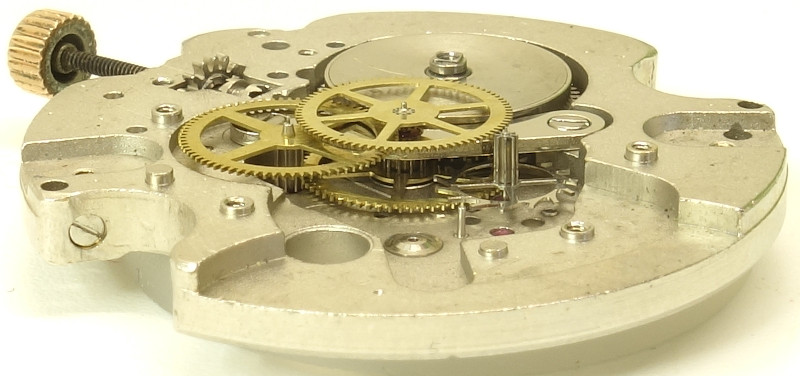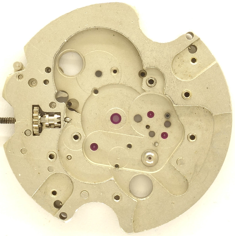 Die Grundplatine, die viel Platz ungenutzt läßt und zwei größere Einbuchtungen für die Zugängigkeit der Zifferblattschraiben besitzt, zeigt immerhin an, dass alle wichtigen Lager, sogar das des zentralen Minutenrads, mit Steinen ausgestattet sind.