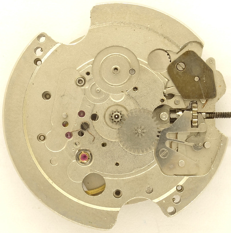 Auf der leeren Zifferblattseite erkennt man den Kupplungsaufzug, sowie den Hebelmechanismus der Datumskorrekturschaltung, die über einen Hebel bei 2 Uhr betätigt wird.