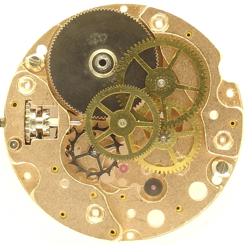 Das Federhaus treibt das Großbodenrad an, gefolgt vom Kleinbodenrad, besagtem Zentralsekundenrad und schließlich dem Stahl-Ankerrad.