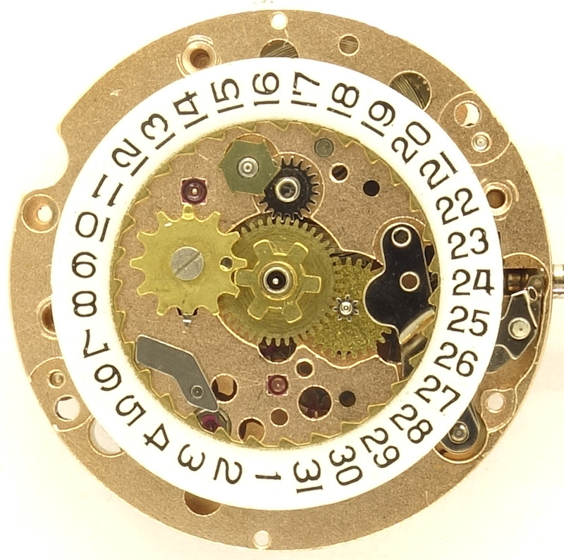 Das Datumsschaltrad besitzt auf der Unterseite einen beweglichen Schaltfinger. Dieser ist im ausgefahrenen Zustand länger als die anderen Zähne und schaltet damit das Datumsrad eine Position weiter.