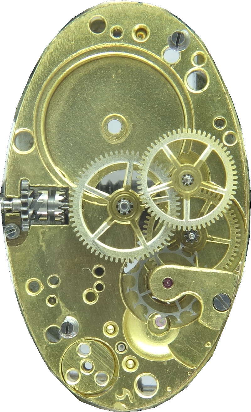 Der Räderwerksaufbau ist typisch für Zylinderwerke, besitzt aber eine Besonderheit, und zwar befindet sich der Zahnkranz des Kleinbodenrades oberhalb des zentralen Minutenrads.