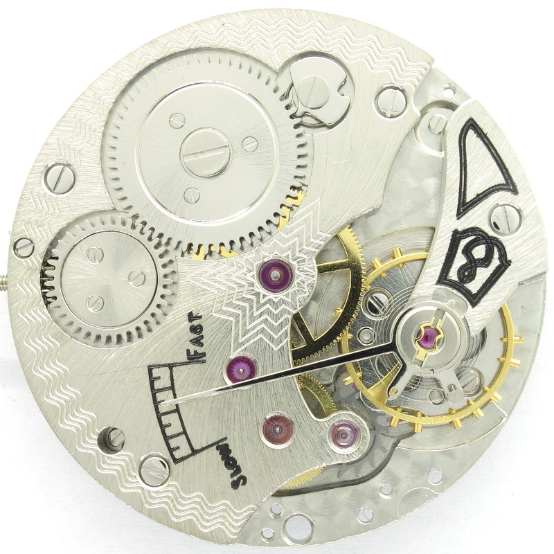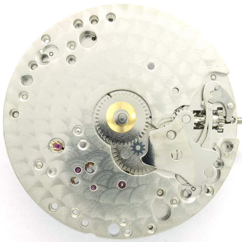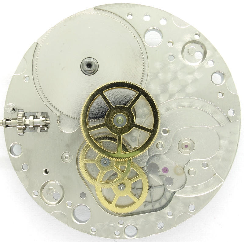 Der Aufbau ist klassisch und besteht aus Federhaus, zentralem Minutenrad, Kleinbodenrad, Sekundenrad und Ankerrad.