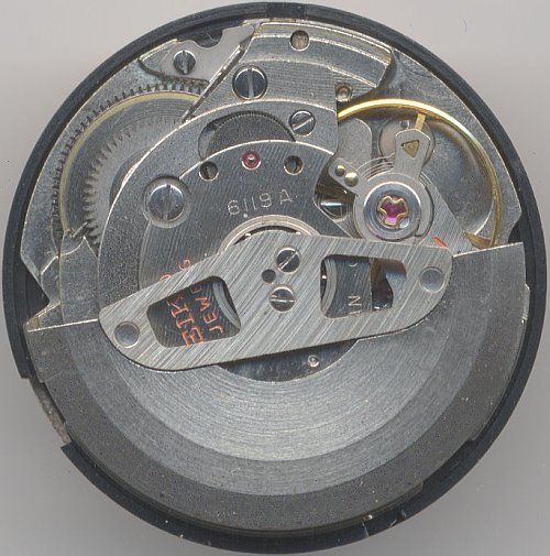 In den späten sechziger Jahren debütierte eines der erfolgreichsten Seiko-Uhrwerke, das Kaliber 6119. Es wurde im Laufe seiner Bauzeit in drei Versionen hergestellt, die hier vorliegende Version 6119A, bei der der Rotor mit zwei seitlichen Schrauben am Lager befestigt wird, ist die älteste Version. Bei den späteren, häufiger anzutreffenden Kalibern 6119B und 6119C wird der Rotor nur mit einer zentralen Schraube befestigt.