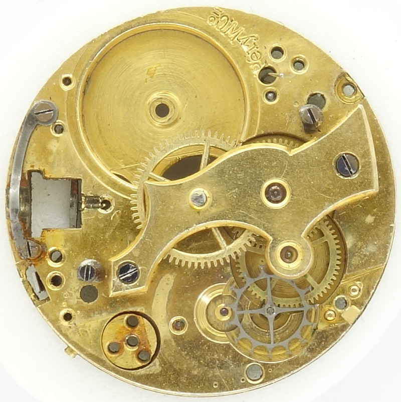 Zum Glück macht dieses 11 linige Werk eine Ausnahme, es läßt sich dank einer entsprechenden Punzierung unter der Räderwerksbrücke klar dem Hersteller Sigma (Pèry Watch Co.) zuordnen. Dass es sich jetzt wohl um das Kaliber Sigma 65 handelt, ist der Punzierung “065” auf der Zifferblattseite geschuldet.