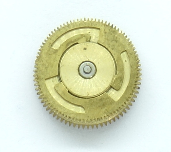 Der Datumsmechanismus ist sehr einfach ausgeführt - ein 12-zähniges Schaltrad greift in das 6-zähnige Sternrad des Stundenrads ein und führt damit alle 24 Stunden eine Umdrehung durch.