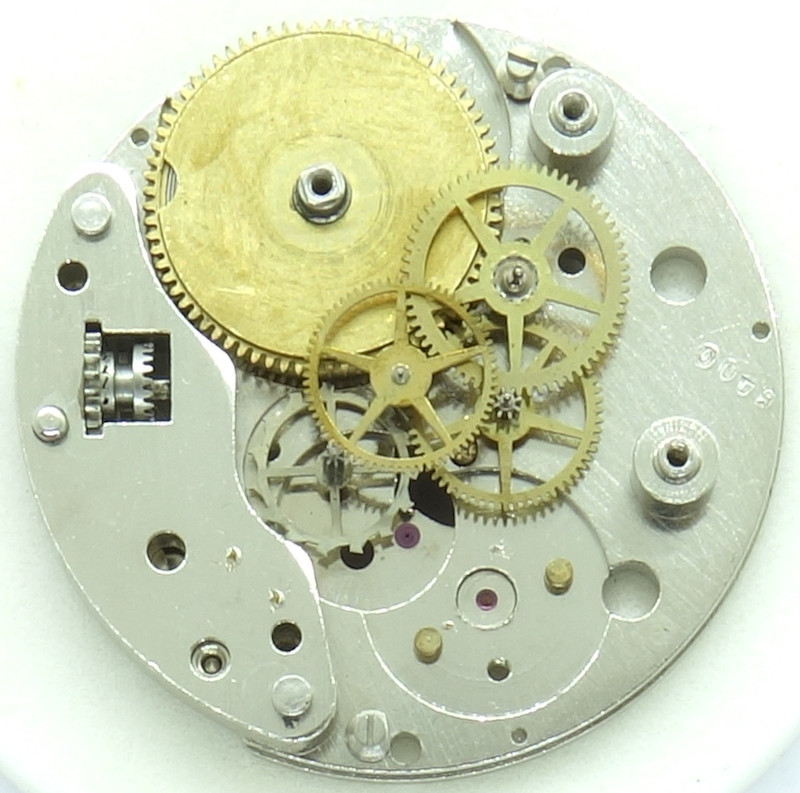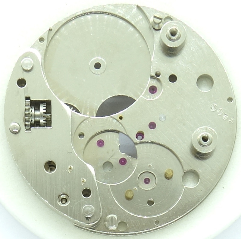 Die Grundplatine der 12-linigen Werks, das mit “5400” gestempelt ist und damit einen Hinweis auf die Kalibernummer gibt, ist ordentlich ausgeführt, vernickelt, und an allen wichtigen Stellen mit Lagersteinen versehen.