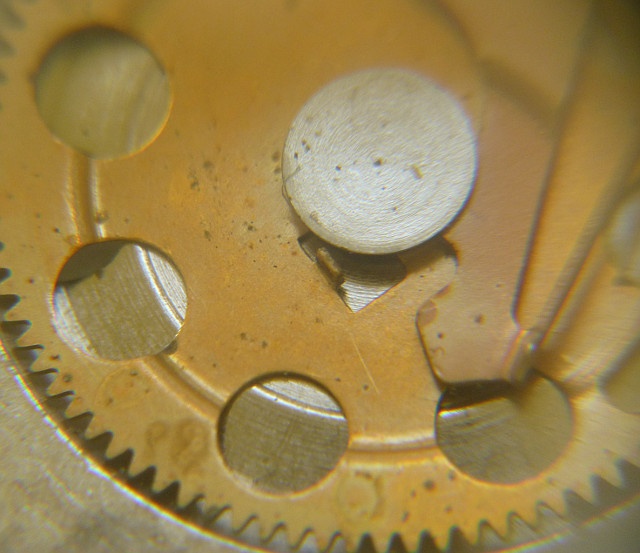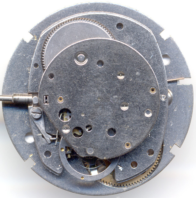 Bei 5 Uhr erkennt man den Schaltnocken. Er sorgt dafür, daß beim Drehen im Uhrzeigersinn die Schaltfeder gespannt wird, und sich diese exakt um Mitternacht schlagartig wieder entspannt, so daß das Datum schnell umspringt. Andererseits wird beim Rückdrehen der Uhrzeit die Feder ausgekuppelt, so daß das Datum nicht rückwärts läuft, wir also eine halbschnelle Datumskorrektur haben.