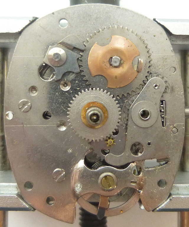 Das Werk selber ist wie alle Timex-Werke zwar theoretisch bis in alle Einzelteile zerlegbar, in der Praxis wird man aber davon Abstand nehmen, weil das Einfädeln von vier Zahnrädern, dem Anker, der Unruh und des Federhauses extrem aufwändig ist.