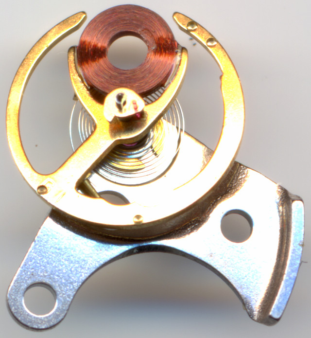Der linke kupferfarbige Hebel dient zum Stoppen der Unruh bei gezogener Krone. Die rechte, sehr dünne Blattfeder dient der Stromzufuhr für die Spule, deren elektromagnetisches Feld dafür sorgt, daß die Unruh von dem bei 6 Uhr gut sichtbaren Permanentmagneten abgestoßen wird.