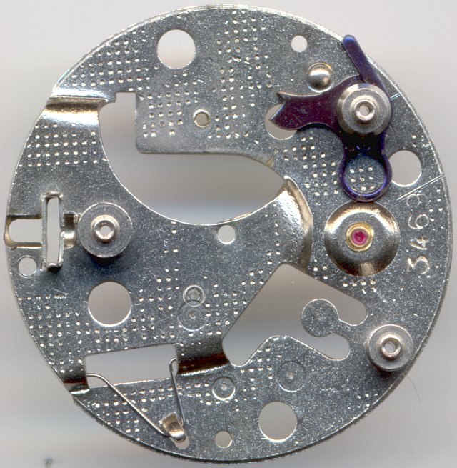 Auf der Zifferblattseite sieht man - mit Ausnahme des geschraubten Lagersteins auf “9” das gewohnte Bild der Kaliberfamilie 24, insbesondere den markanten Wippenaufzug, der hier noch, ebenso wie sämtliche Zahnräder, aus Metall ist. Sieben Jahre später, ab 1976, wurde der Aufzug in der Familie 24 aus Plastik gefertigt.