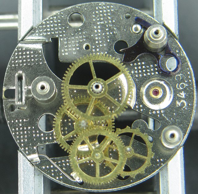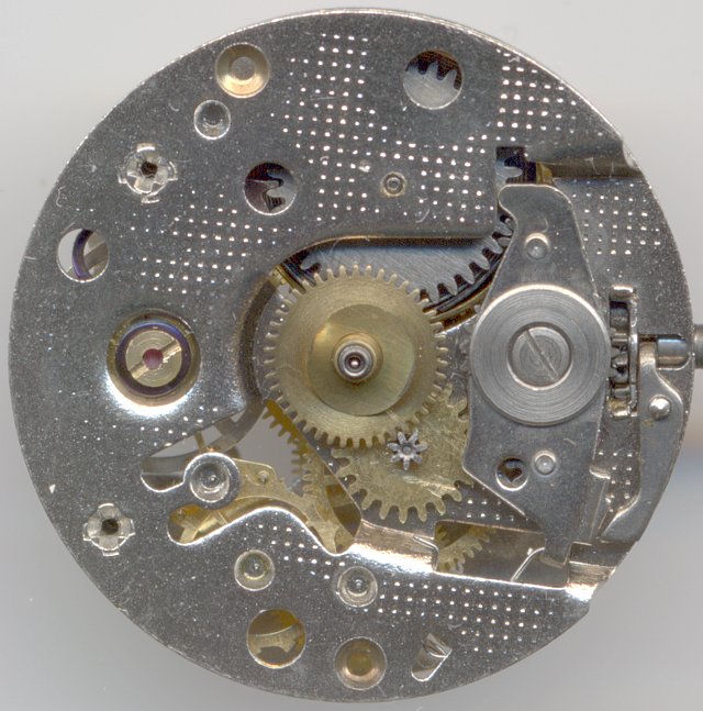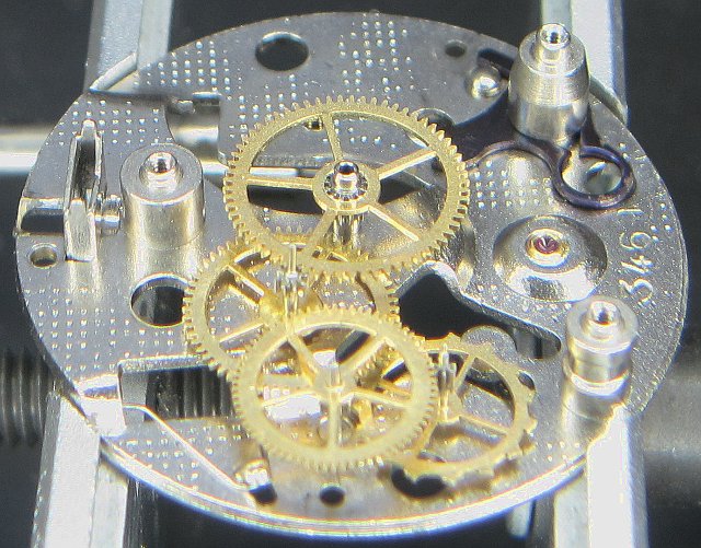 Der Aufbau des Werks ist einfach, aber standardgemäß. Auf “6” findet man noch ein Sekundenrad vor, so daß dieses Werk konstruktiv auch in der Lage wäre, eine kleine Sekunde auf “6” anzuzeigen; in diesem Fall wird jedoch eine indirekte Zentralsekunde verwendet. Einzige Schwierigkeit bei diesem Aufbau ist wiederum die enorme Bauhöhe und die dadurch sehr langen Räderachsen, die eine Montage erschweren.