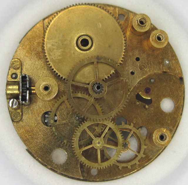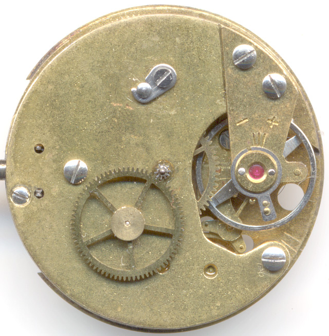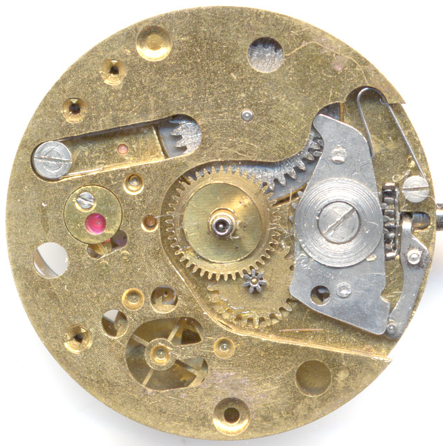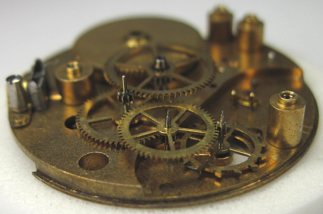 Die messingfarbene Grundplatine läßt bereits erkennen, daß es sich hier um ein einfaches Pfeilerwerk handelt. Bis auf die Unruh ist keines der Lager mit Steinen ausgestattet.