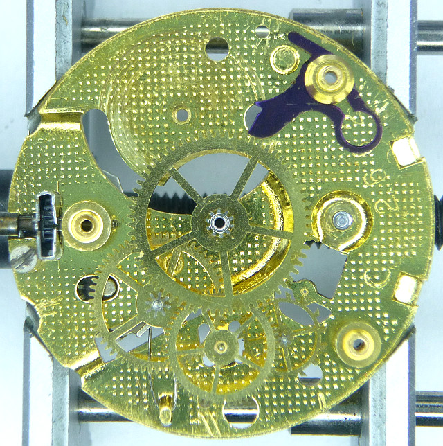 Video on YouTubeDie Messing-Grundplatine ist gestanzt und mit einem Punktmuster “dekoriert”. Die obere Werkplatine ist auf drei Pfeilern gelagert.