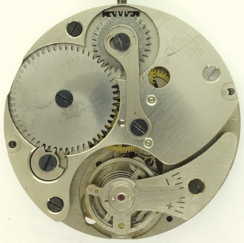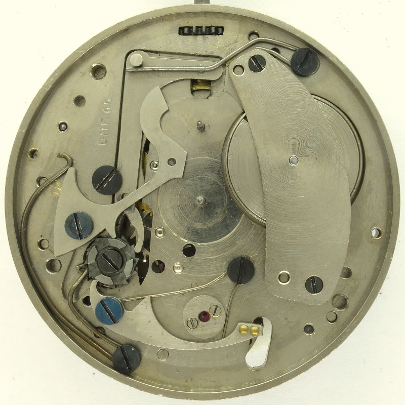 Zwischen 1953 und 1963 wurde das 18 1/2 linige Stoppuhrenkaliber UMF M65 (hier in der Ausführung M 65 A mit 1/10-Sekunden-Auflösung) produziert, im Zuge der Änderung des Kalibernummernsystems auch als UMF 80-52 bezeichnet.