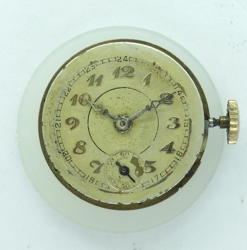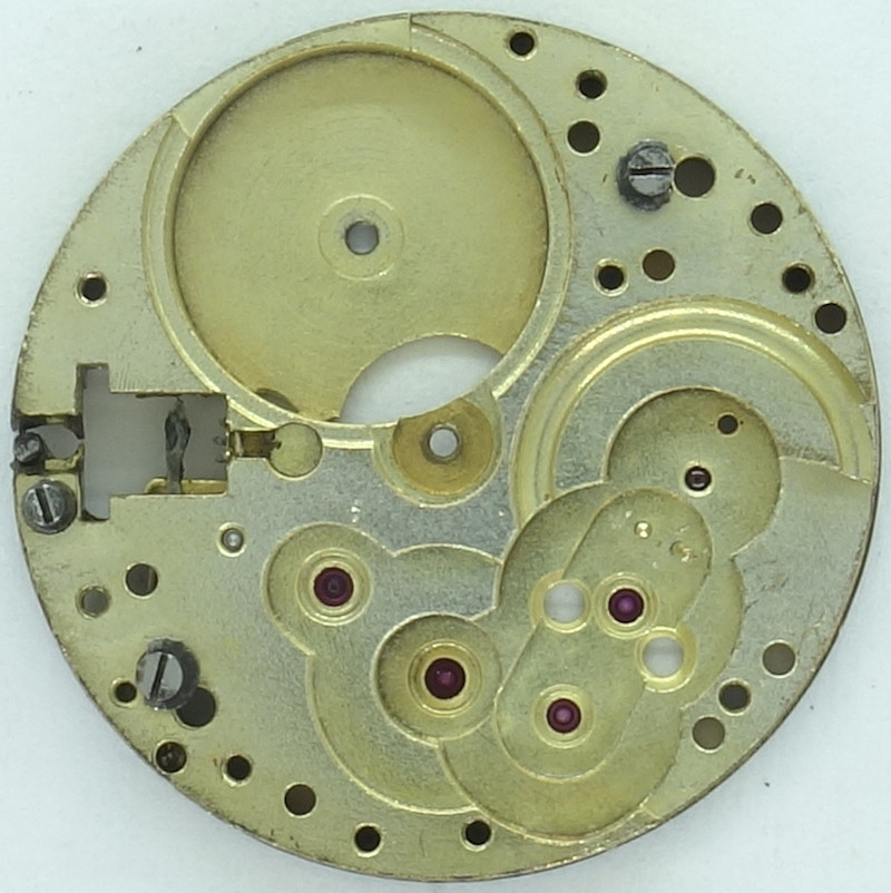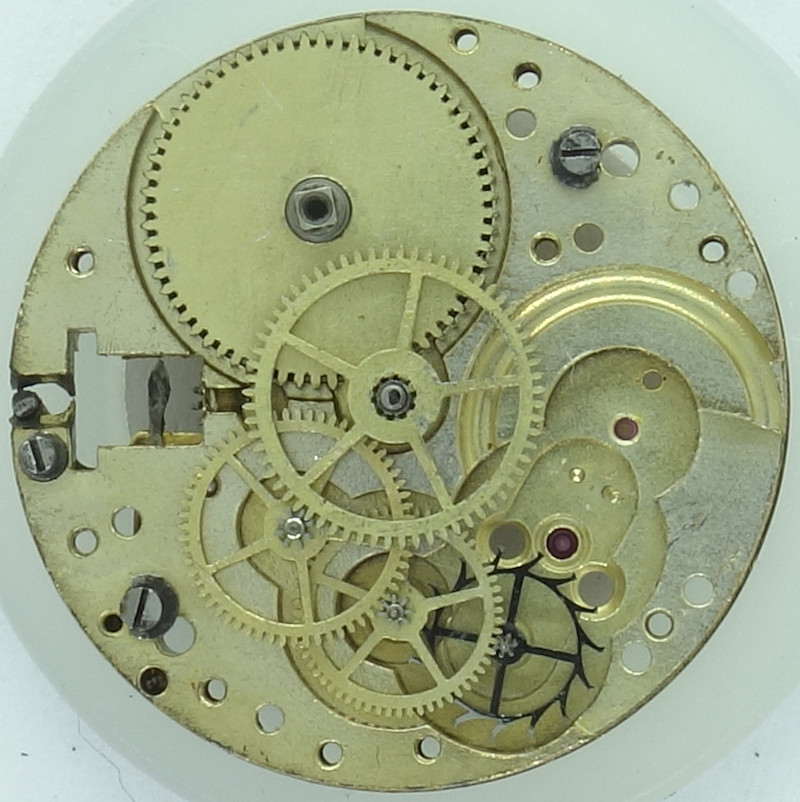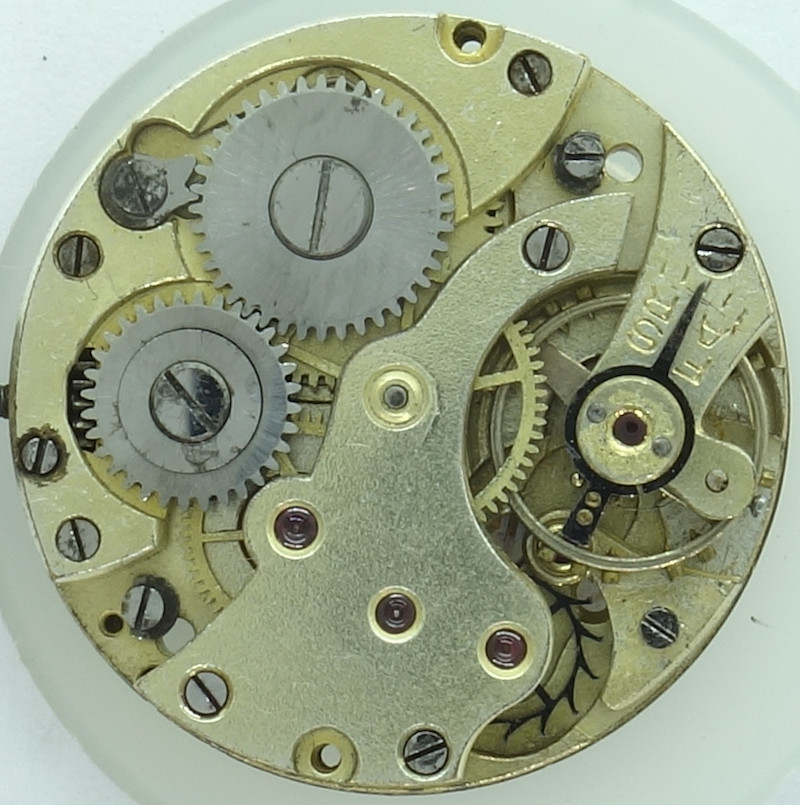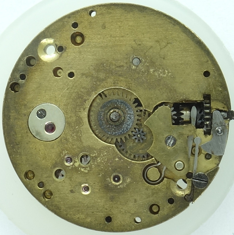 Das Urofa 52 ist hier weder werksseitig noch zifferblattseitig gepunzt, ist aber wegen der charakteristischen Winkelhebelfeder eindeutig zu erkennen.